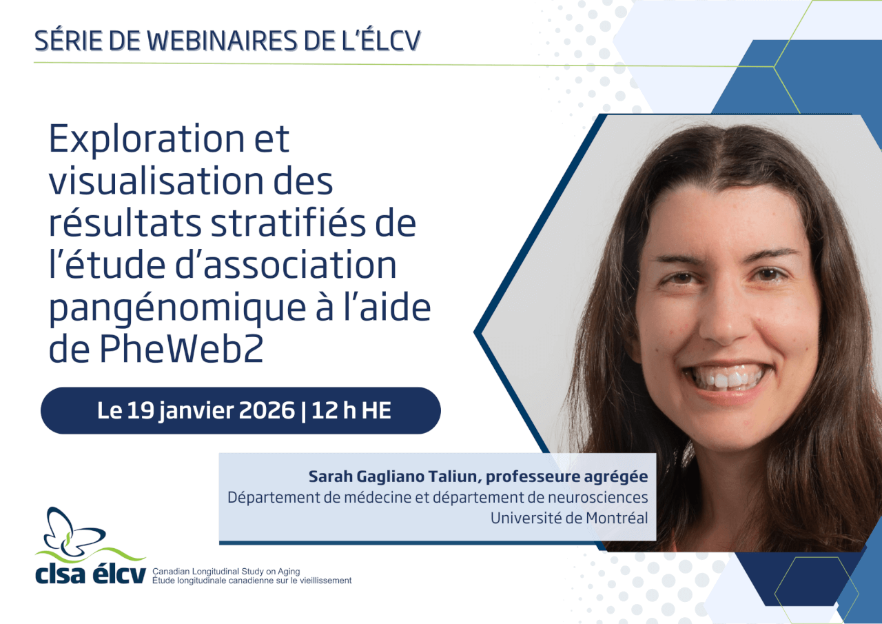 Join us Monday, January 19 at 12 PM ET for the CLSA webinar “Exploring and visualizing stratified genome-wide association study results with PheWeb2.” The webinar will be presented by Sarah Gagliano Taliun, Associate Professor in the Department of Medicine and Department of Neurosciences at the University of Montreal.