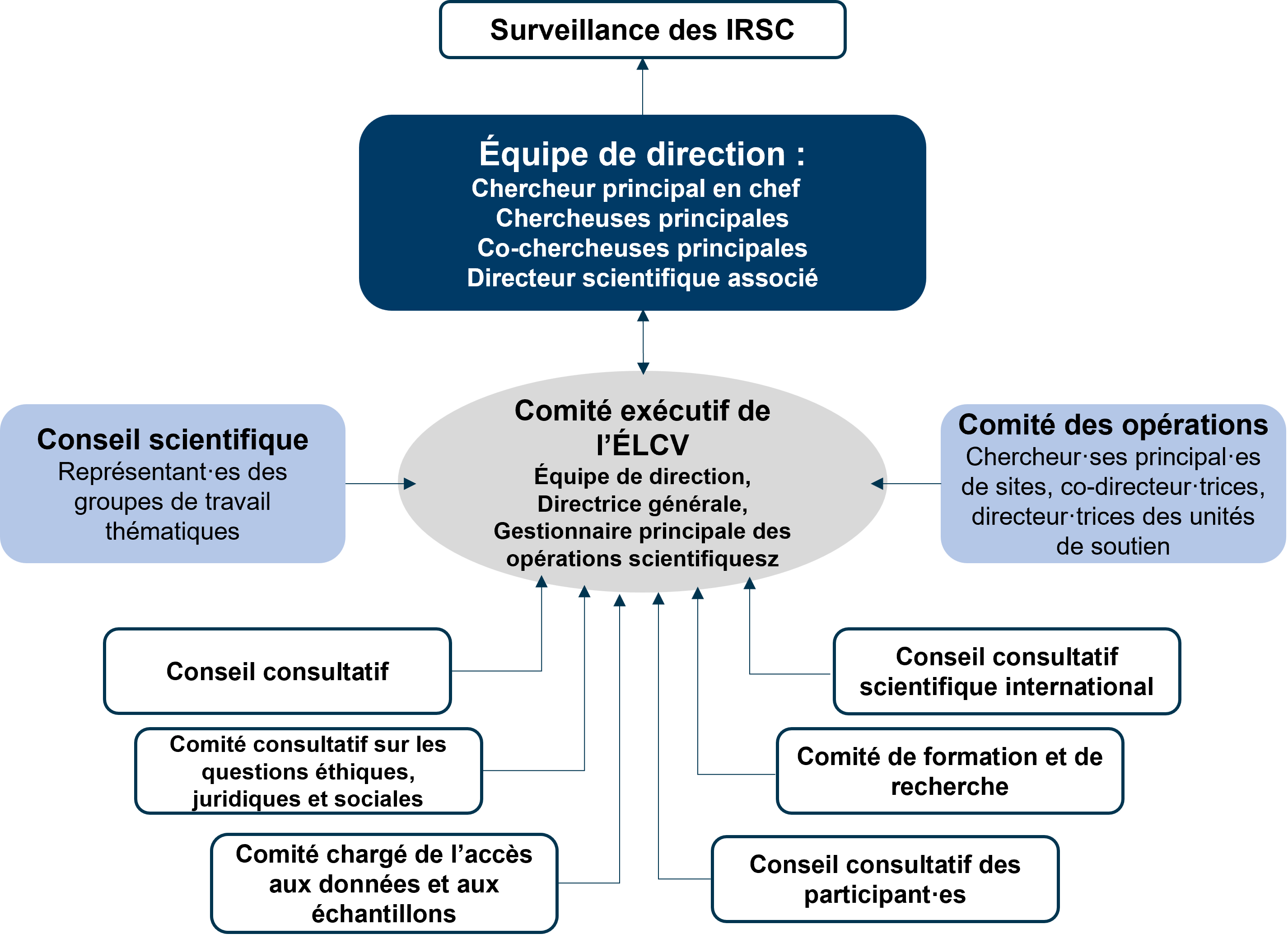 La structure de gouvernance et de gestion appuie la mise en œuvre, les opération, la fonctionnalité et la durabilité de la plate-forme de recherche de l'ÉLCV. Elle se compose de deux conseils et de six comités qui informe le comité de direction de l'ÉLCV, qui est composé des directeur·rice exécutif et gestionnaire principal·e des opérations scientifiques de l'ÉLCV. Le comité de direction est responsable a l'instituts de recherche en santé du Canada (IRSC).