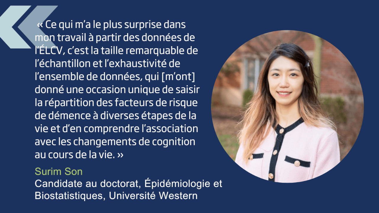 What has surprised me most about working with the CLSA is the large sample size and comprehensiveness of the dataset, allowing me to analyze data from different life stages. This life-course approach has provided me a unique opportunity to capture the distribution of dementia risk factors across different life stages and understand how their association with cognition changes over the lifespan. As I continue my academic journey, the CLSA will help to further refine my analytical skills, just as it has throughout my research so far.