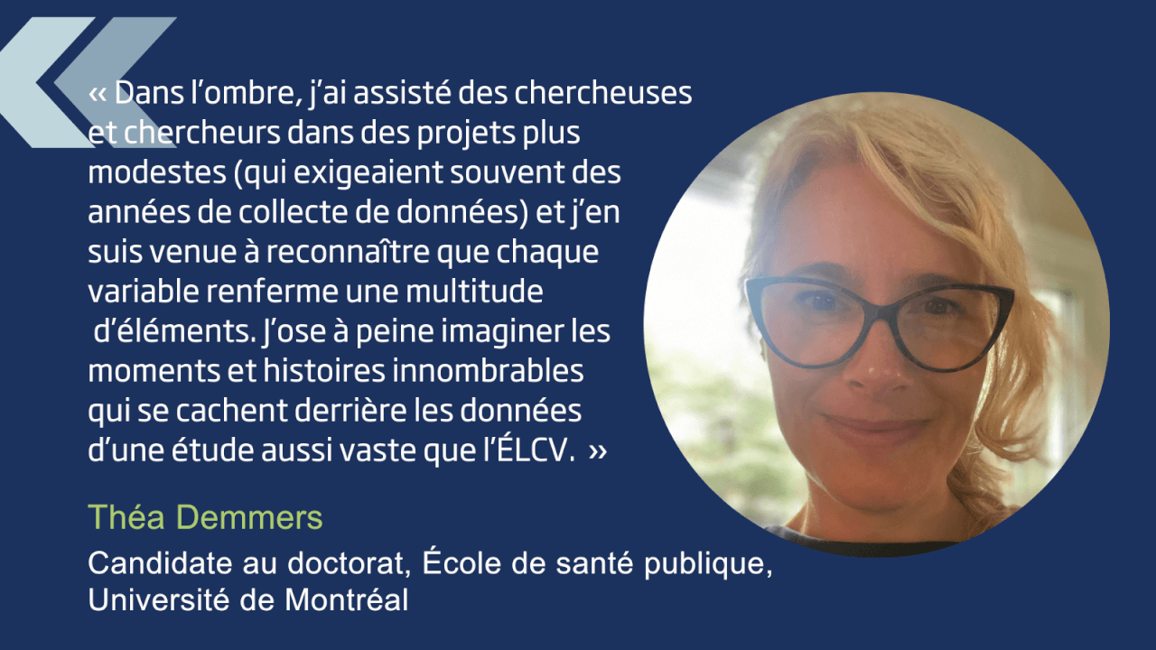 J’ai travaillé à ce projet à la fois à titre de professionnelle de recherche à l’Université Concordia et d’étudiante au doctorat en santé publique. J’ai appris à accéder aux données et à effectuer une évaluation critique des variables nécessaires. L’ÉLCV est une énorme plateforme qui reflète le travail acharné d’une foule d’intervenants. Dans l’ombre, j’ai assisté des chercheuses et chercheurs dans des projets plus modestes (qui exigeaient souvent des années de collecte de données) et j’en suis venue à reconnaître que chaque variable renferme une multitude d’éléments. J’ose à peine imaginer les moments et histoires innombrables qui se cachent derrière les données d’une étude aussi vaste que l’ÉLCV.
